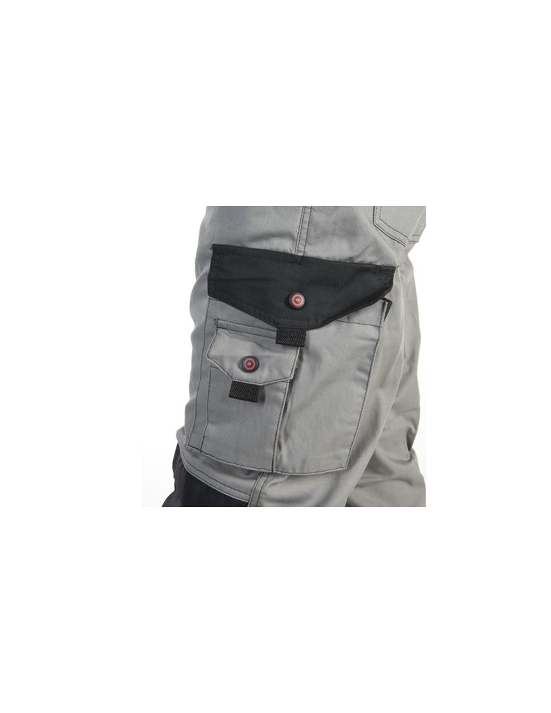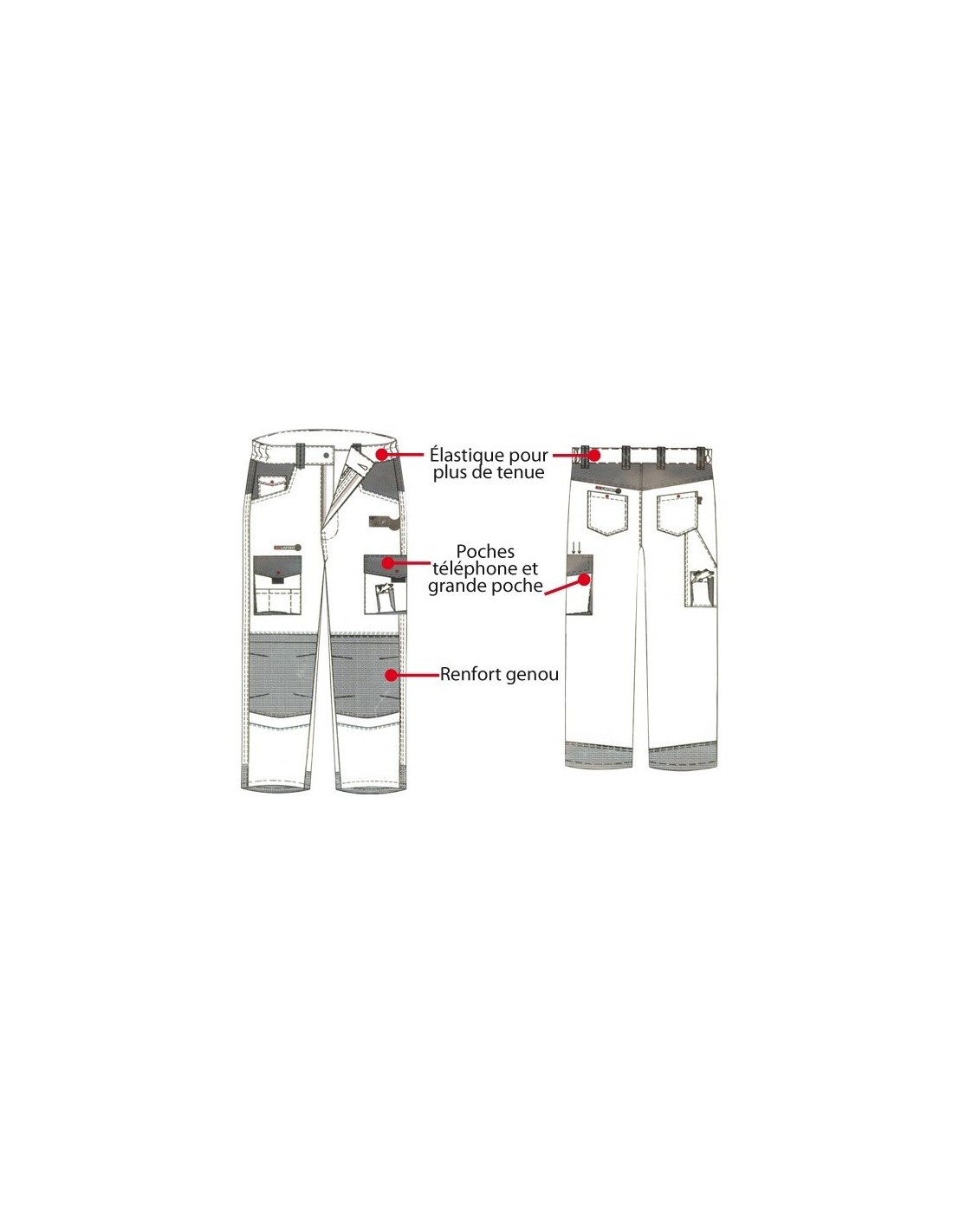 Ceinture élastiquée côté à 6 passants double - 2 poches cavalière dont une avec poche monnaie - sangle porte outils - 2 poches cuisse à rabat fermé par grippers. une avec surpoche à 2 soufflets et rabat et l'autre avec 3 surpoches plaquées - poches mousses genoux avec deux niveaux de réglages avec ouverture par le dessus en tissu renforcé Norme EN 14404 - renforts bas arrière du pantalon avec surpoche à soufflets fermée par rabat - Tissu label OEKO TEX.