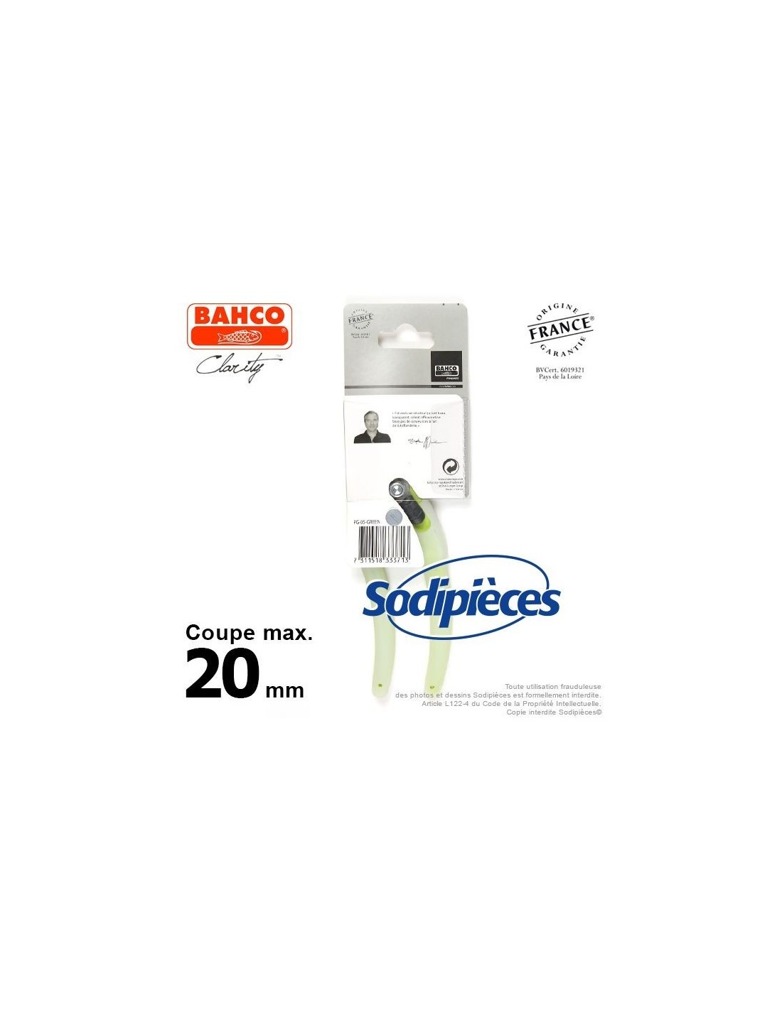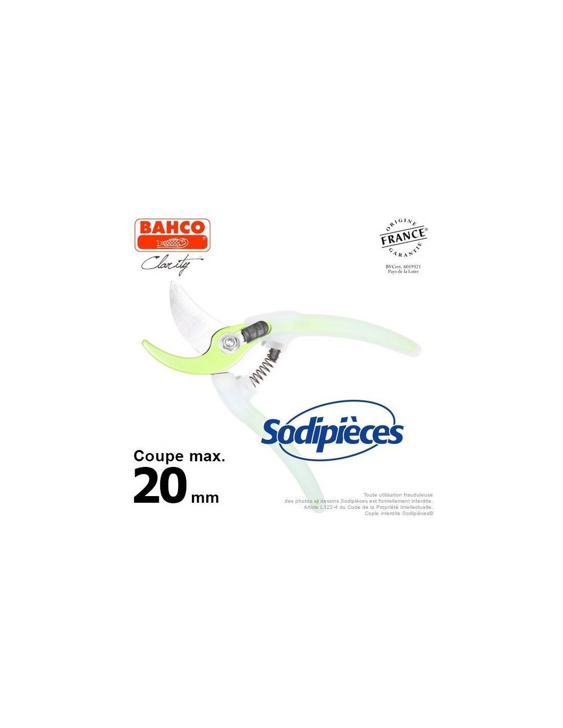 Sécateur acier trempé Clarity Bahco Pradines PG-05-Green. 20 mm. Confort. Fabriqué en France