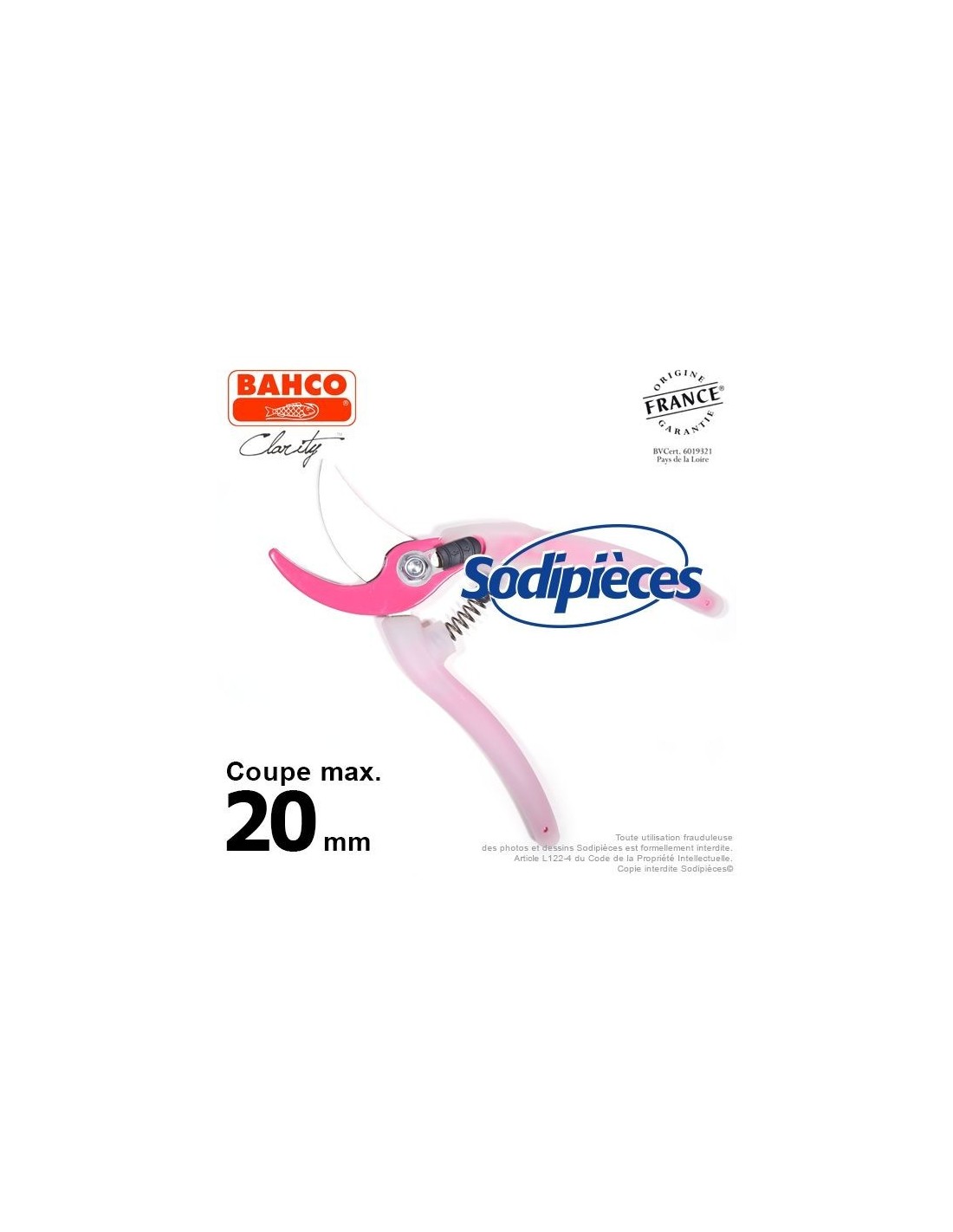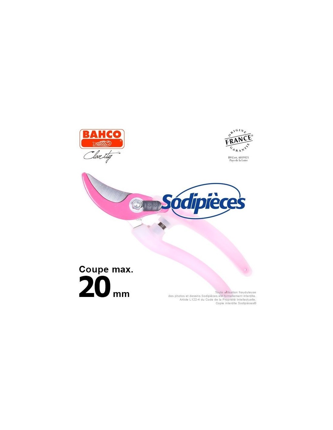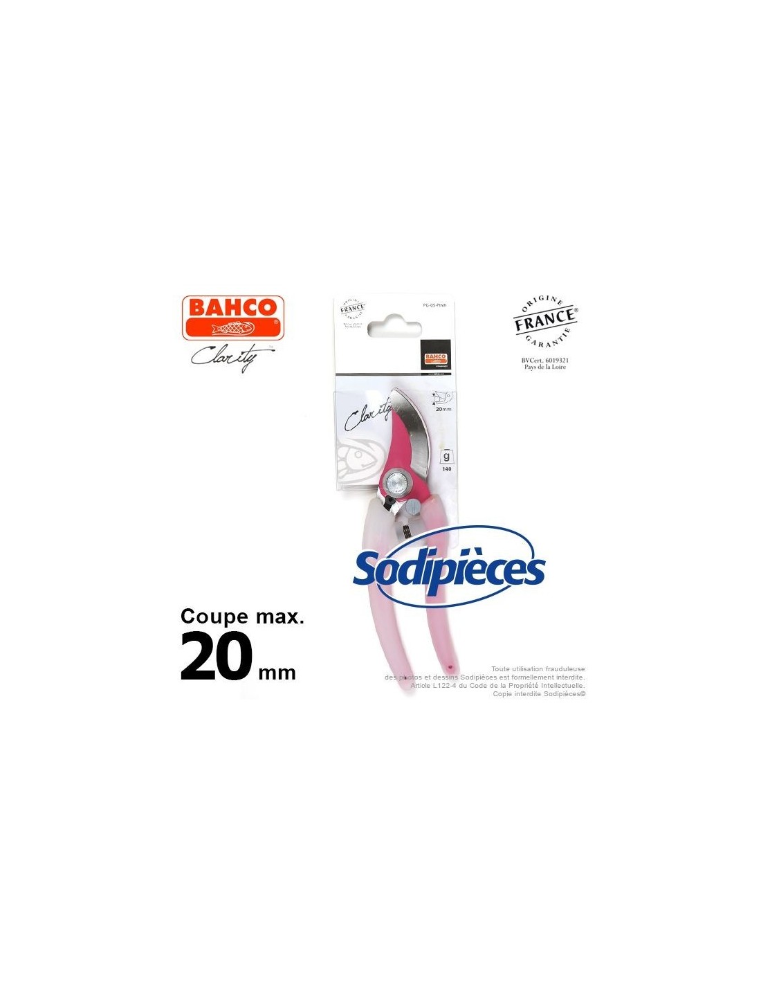Sécateur acier trempé Clarity Bahco Pradines PG-05-Pink. 20 mm. Confort. Fabriqué en France